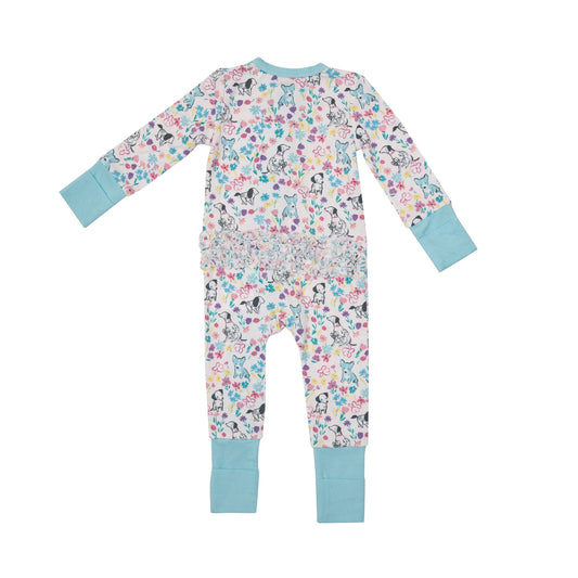 2 Way Ruffle Back Zipper Romper in Dog and Floral