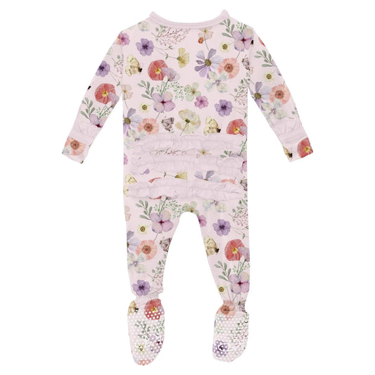 Print Classic Ruffle Footie with 2 Way Zipper in Shrinking Violet Pressed Flowers