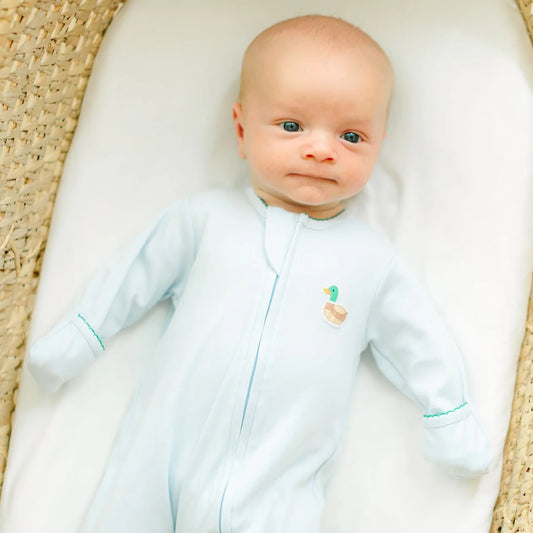 Touchdown Cutie Embroidered Zip Footie in Blue Stripe