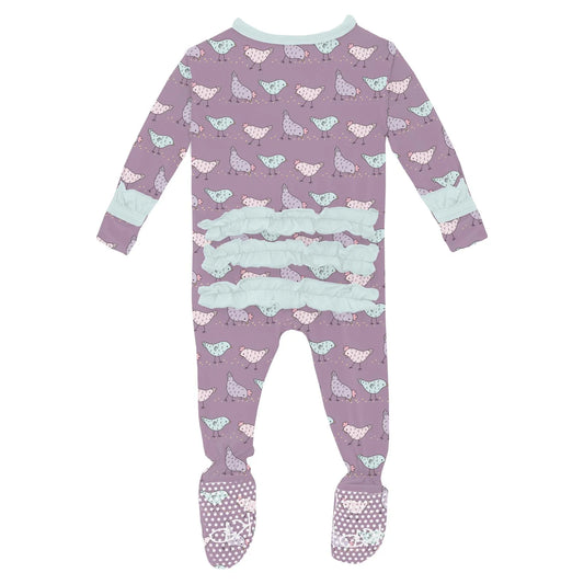 Print Classic Ruffle Footie with 2 Way Zipper in Lavender Chickens