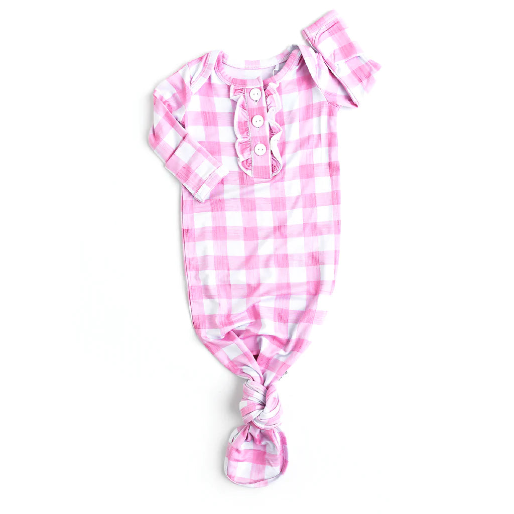 Wooden Gigi and Max buttons and the slits at the shoulder make taking on and off baby from the top down very easy! Knot on the gown can be tied and untied as needed for quick diaper changes!