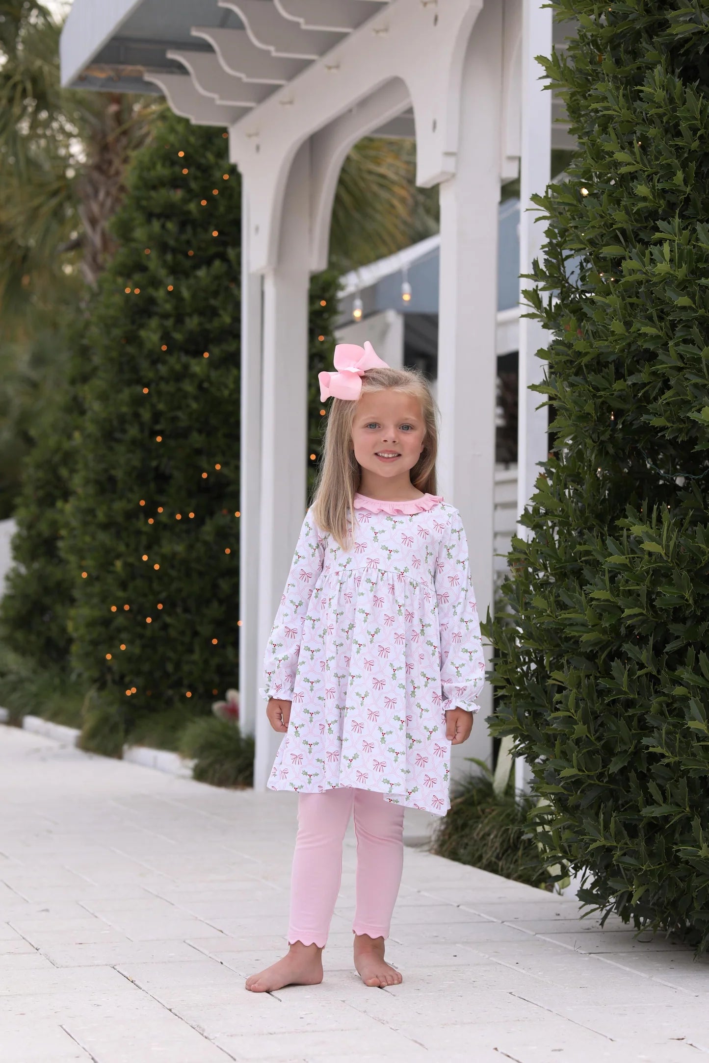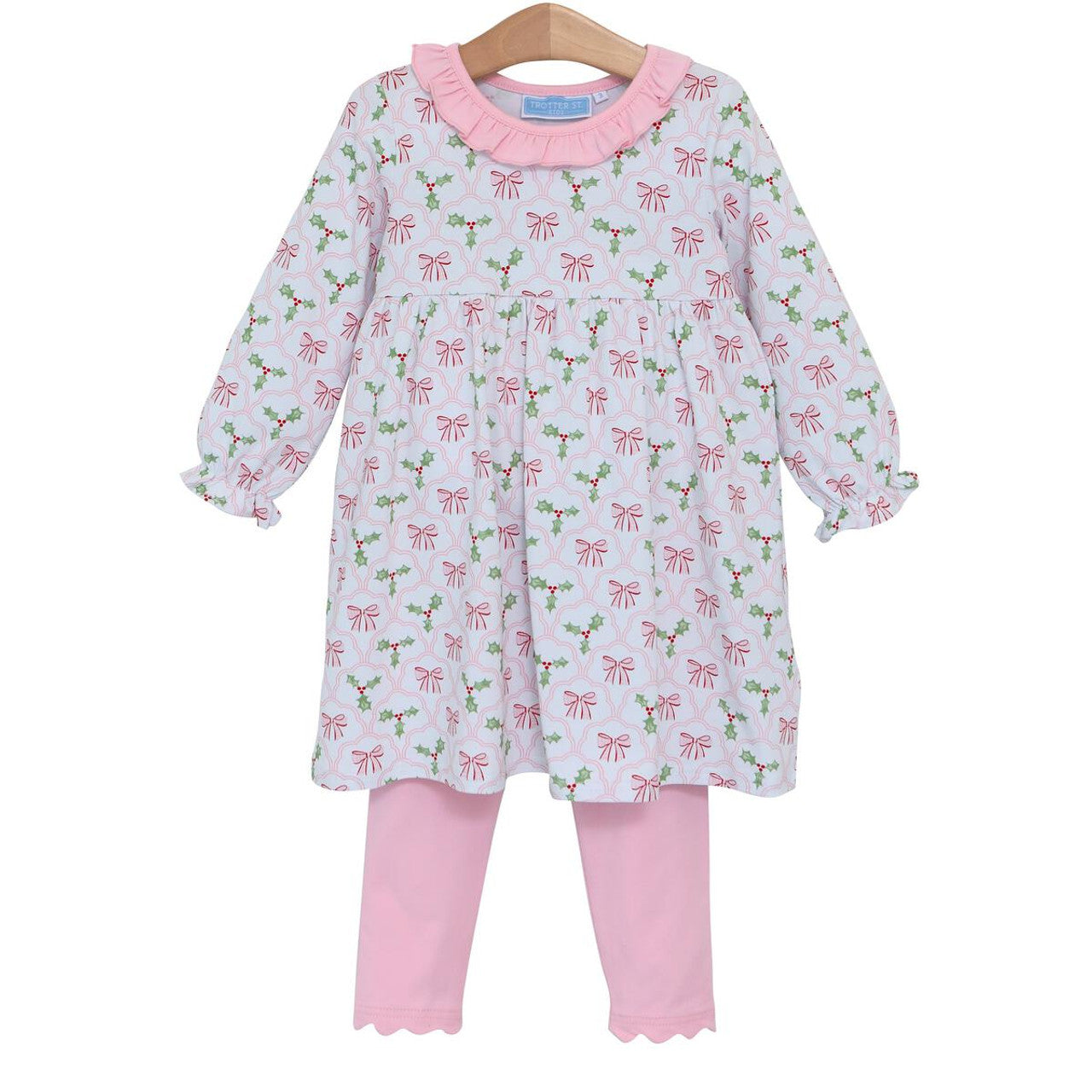 The sweetest holiday set. Pairs with the rest of the Berries & Bows Collection for the perfect sibling match. 2 piece set includes ruffled tunic with holly berries and bows print and solid pink leggings that will match lots of other pieces in her wardrobe!