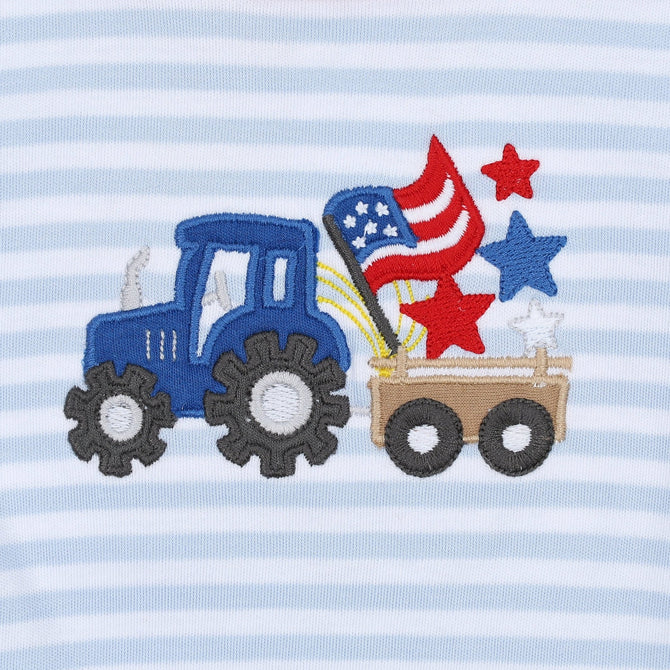 Sleeveless striped playsuit with applique. Snap closures at back and bottom.