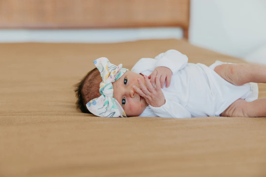Stretchy knit headband with bow that will grow with your baby through their first few months