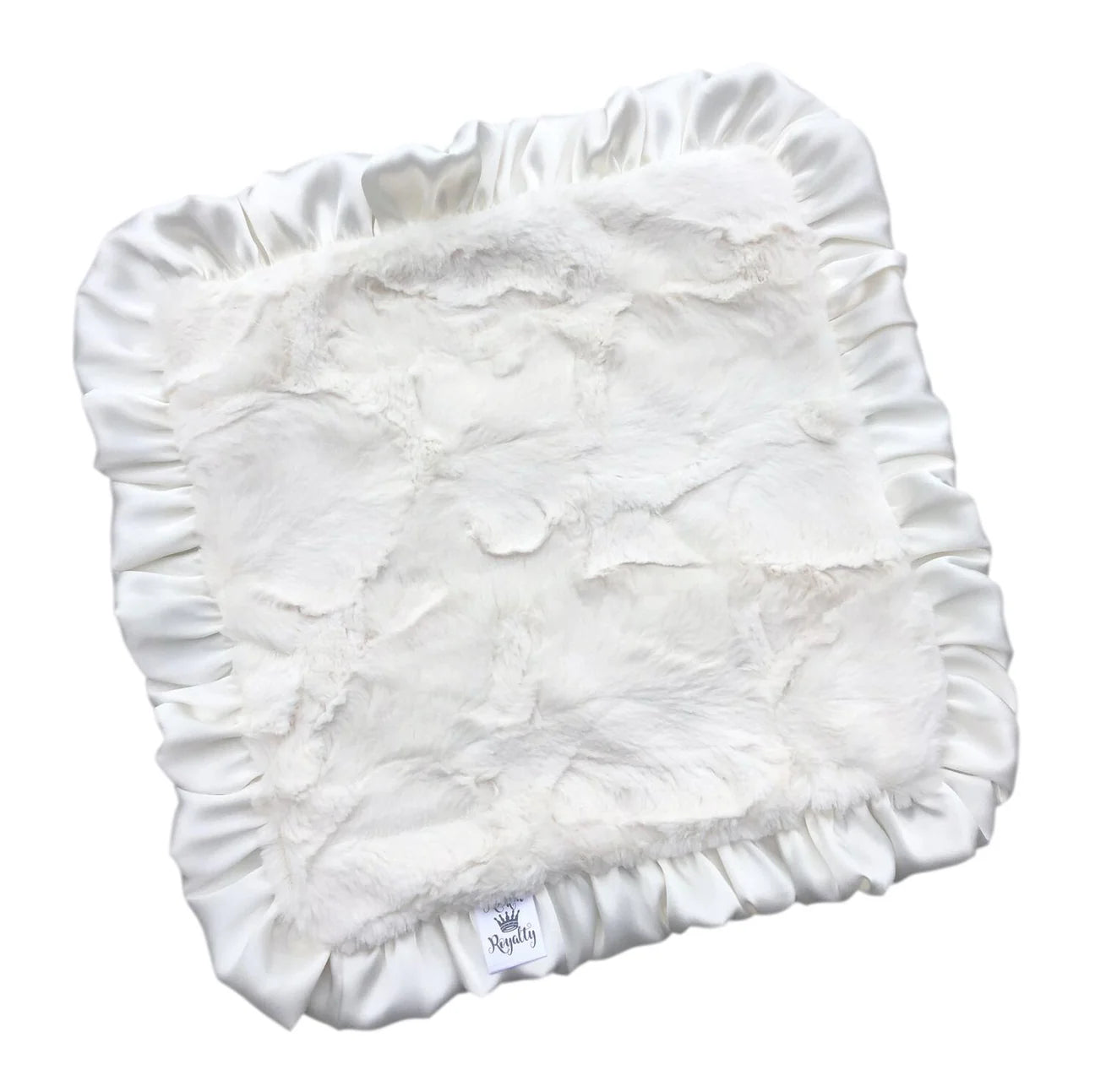 This luxurious plush lovie has soft faux fur on both sides and is framed with a silky satin ruffle. It measures approximately 14x14" and is made in the USA.