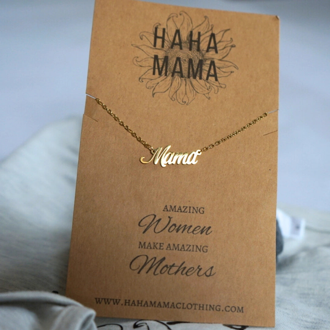 This mama necklace is the ideal present for any mom or soon-to-be mom! The packaging is simply stunning and says "Amazing women make amazing mothers". The dainty pendant features delicate script that reads mama, making it a cherished gift for years to come. The chain measures 16" with a 2" extender and is made of hypoallergenic stainless steel with a 18K gold plating for high quality and gorgeous design.