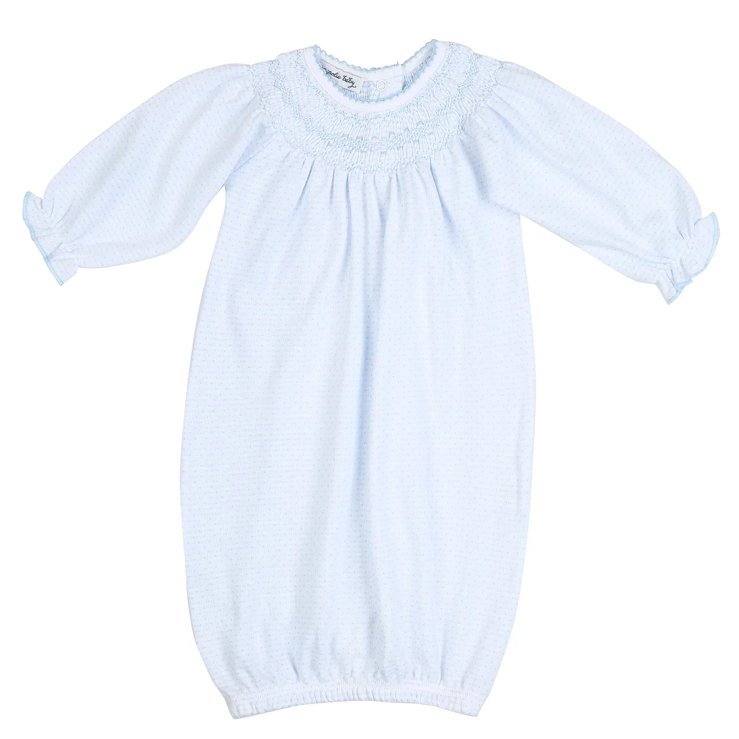 Long sleeve smocked gown. Snaps at back. Elastic at bottom.