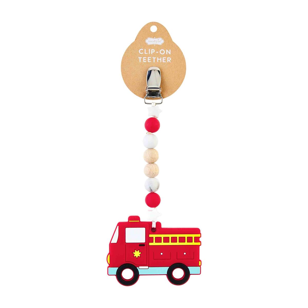 Soothe a teething baby's gums with this adorable Clip-On Teether. The clip on silicone bauble teether features a fire truck shape. This teether is intended for babies ages up to 18M. This teether is easily attachable to any piece of clothing.