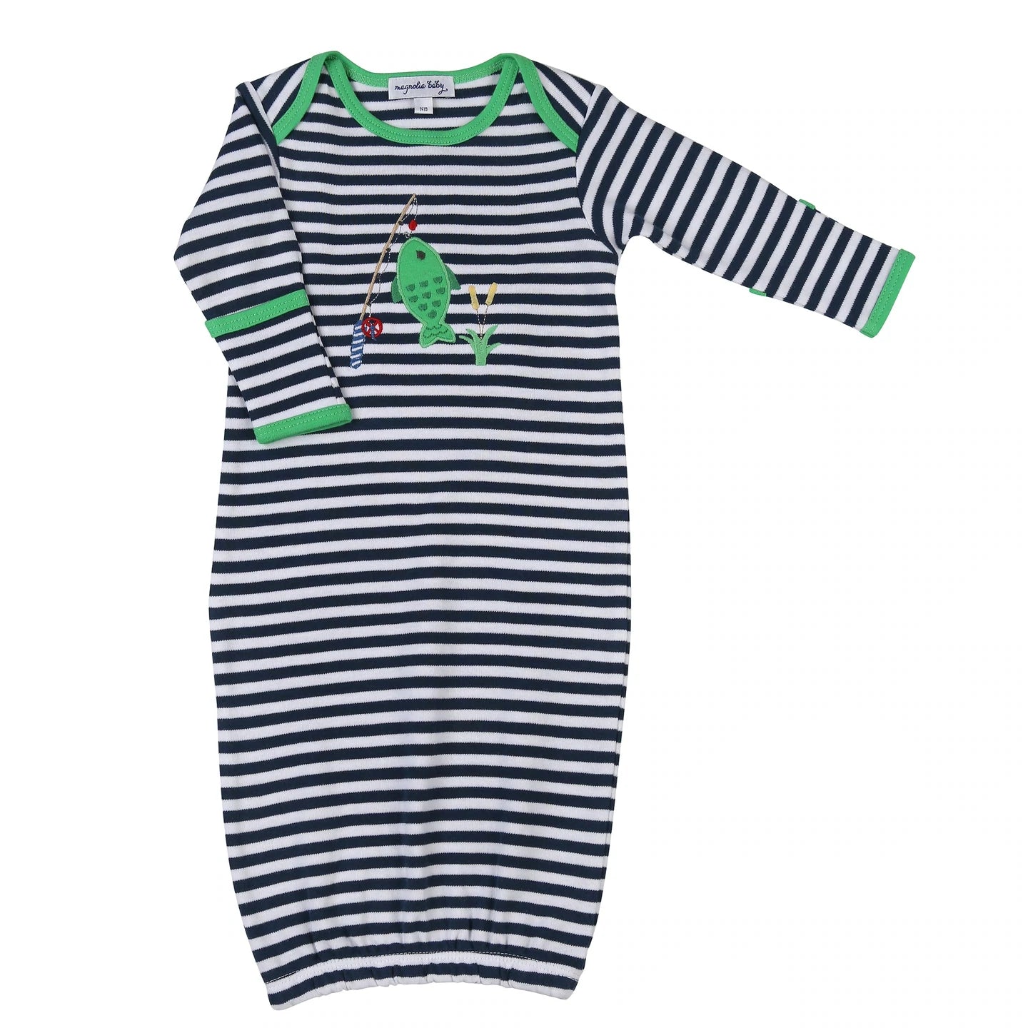 Long sleeve striped gown with fish applique. Elastic at bottom. Fold-over hand cuffs to prevent scratching. Elastic at bottom.