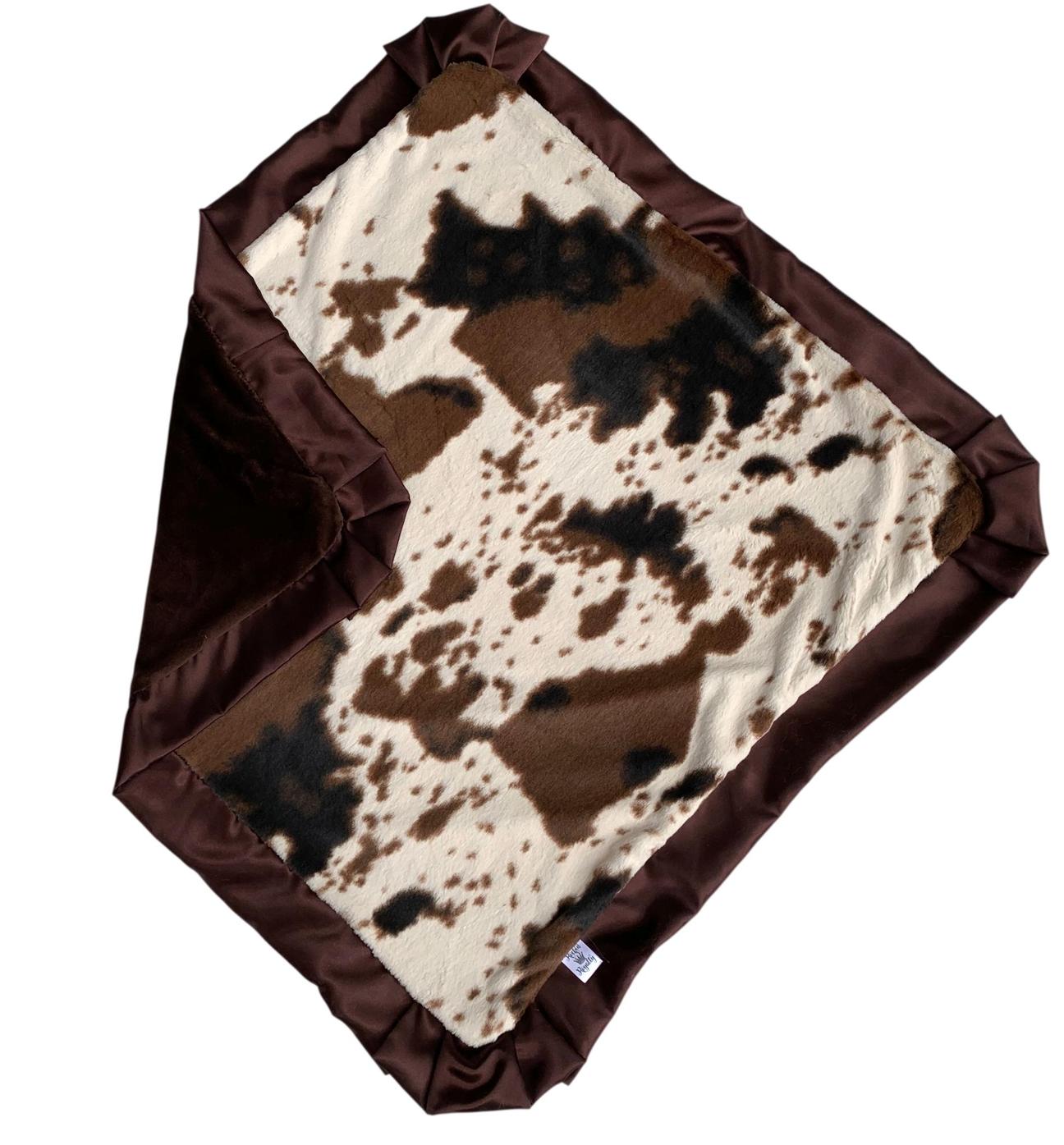 This luxurious plush blanket has a Cow print backed with faux fur and framed with a silky satin ruffle. It measures approximately 34" X 34" and is made in the USA.