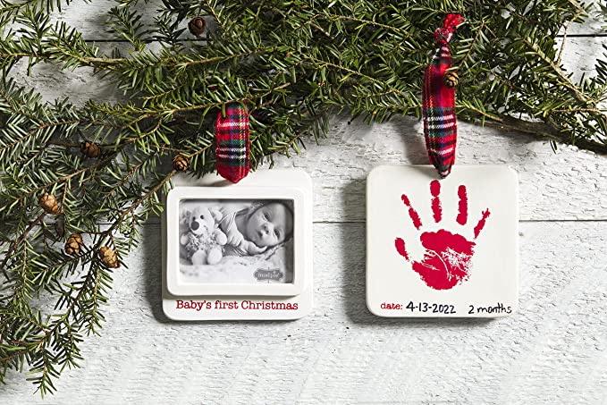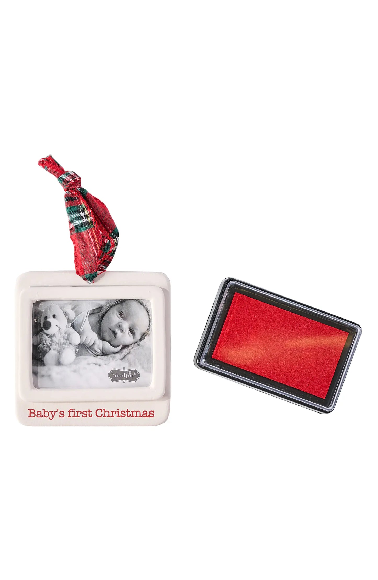 Our First Christmas Handprint Ornament Kit is a true memory maker. The two piece set comes with a ceramic photo ornament with tartan loop hanger. The front of the ornament reads "Baby's first Christmas". The ornament comes with a non-toxic ink pad for handprint personalization. Bake at 300 degrees for 30 minutes.