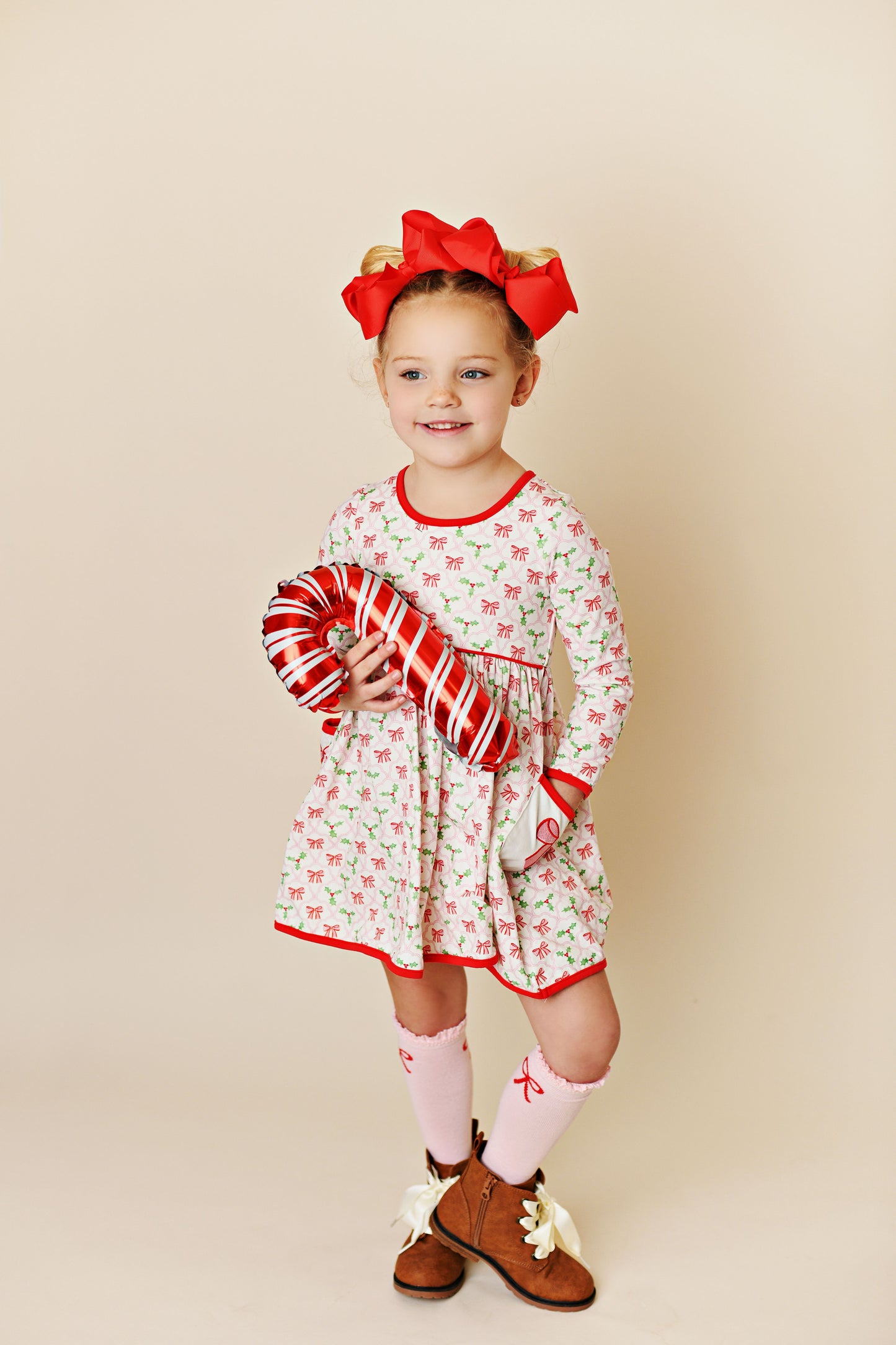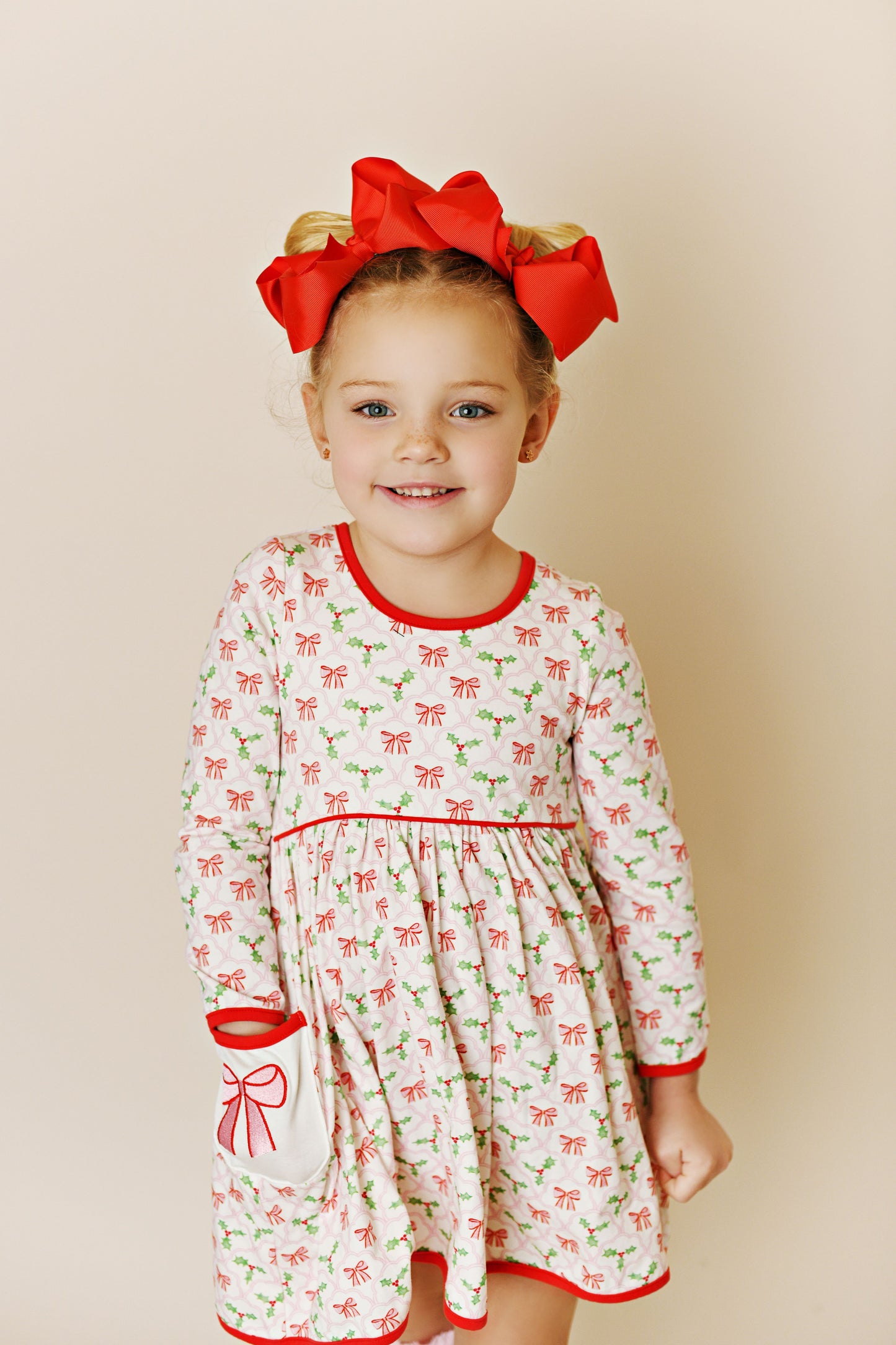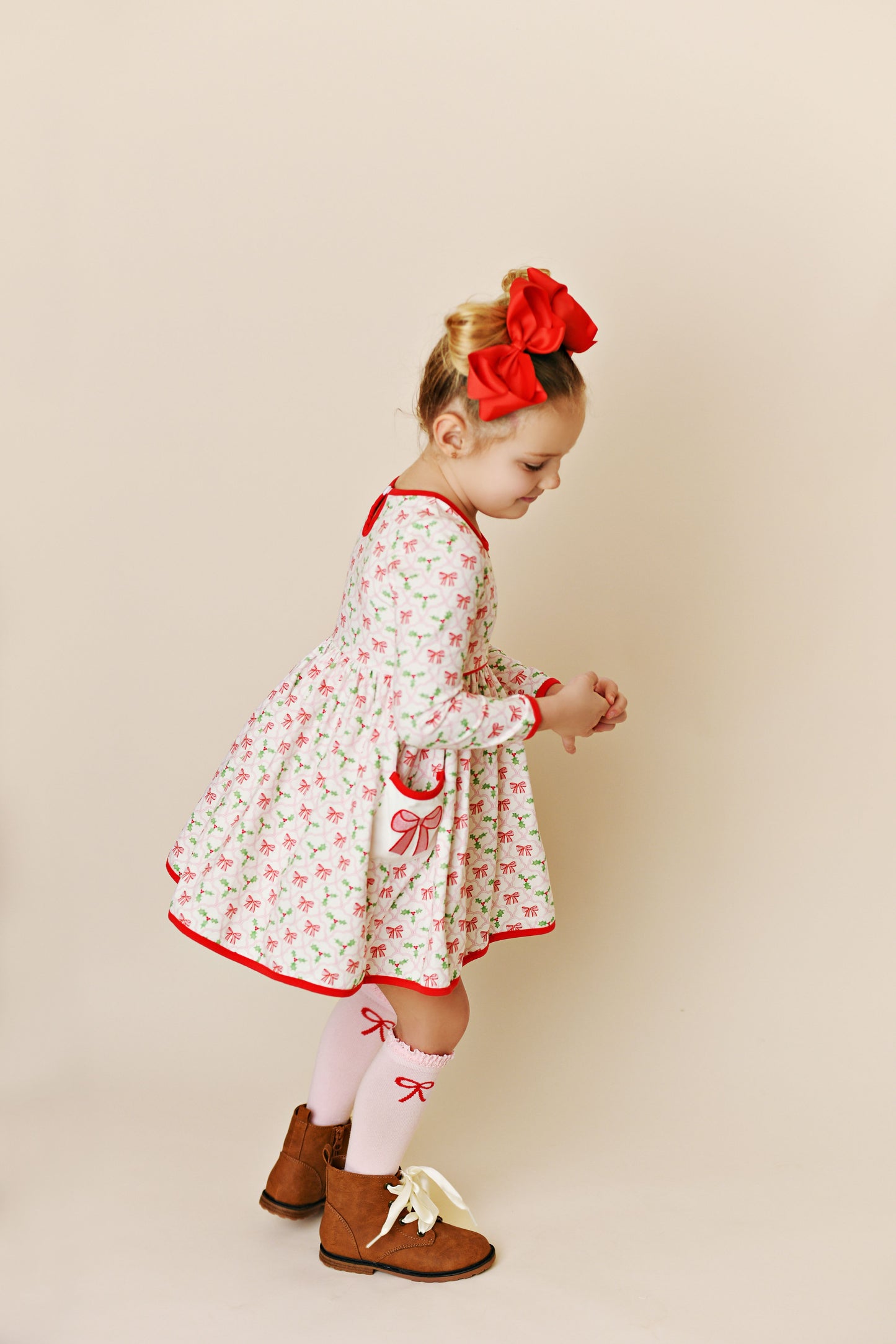 Long Sleeve dress with embroidered pockets. Keyhole back.