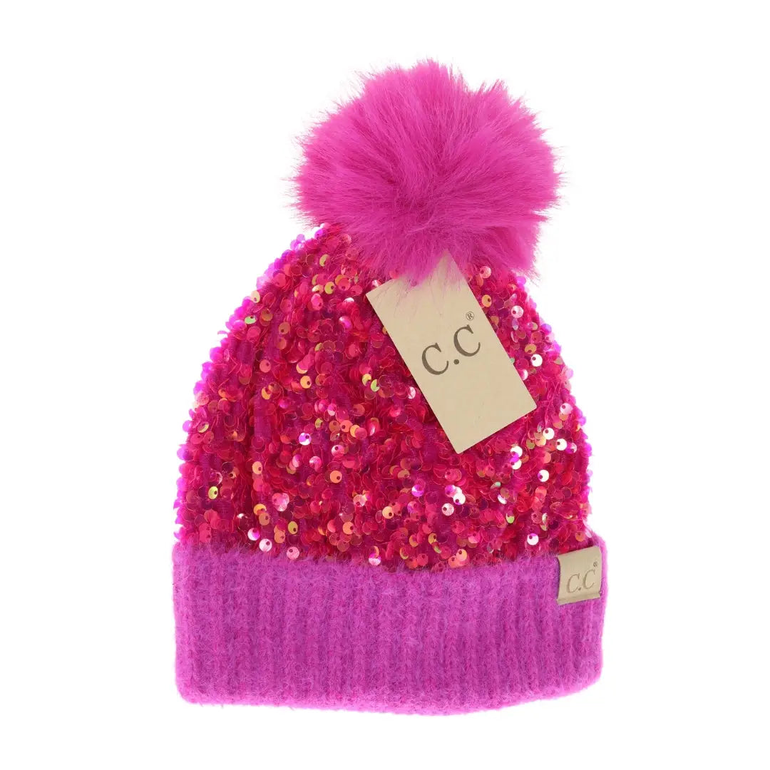 Hot Pink Sequin Faux Fur Pom Kids Beanie