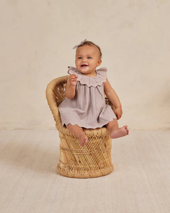 Sleeveless dress made from soft woven cotton. Features scalloped embroidery on collar and skirt hem.