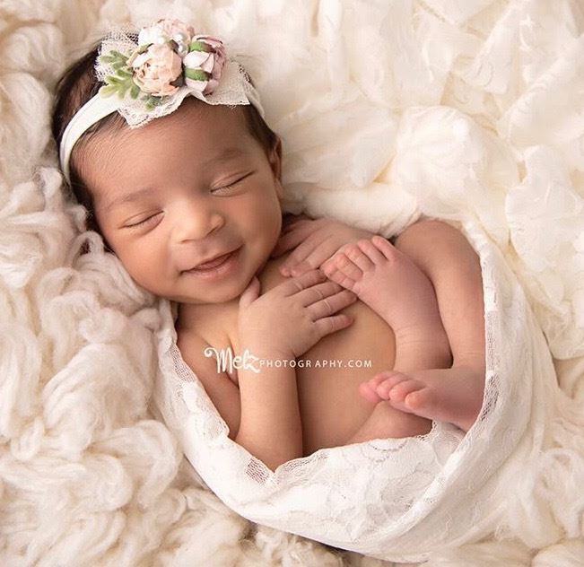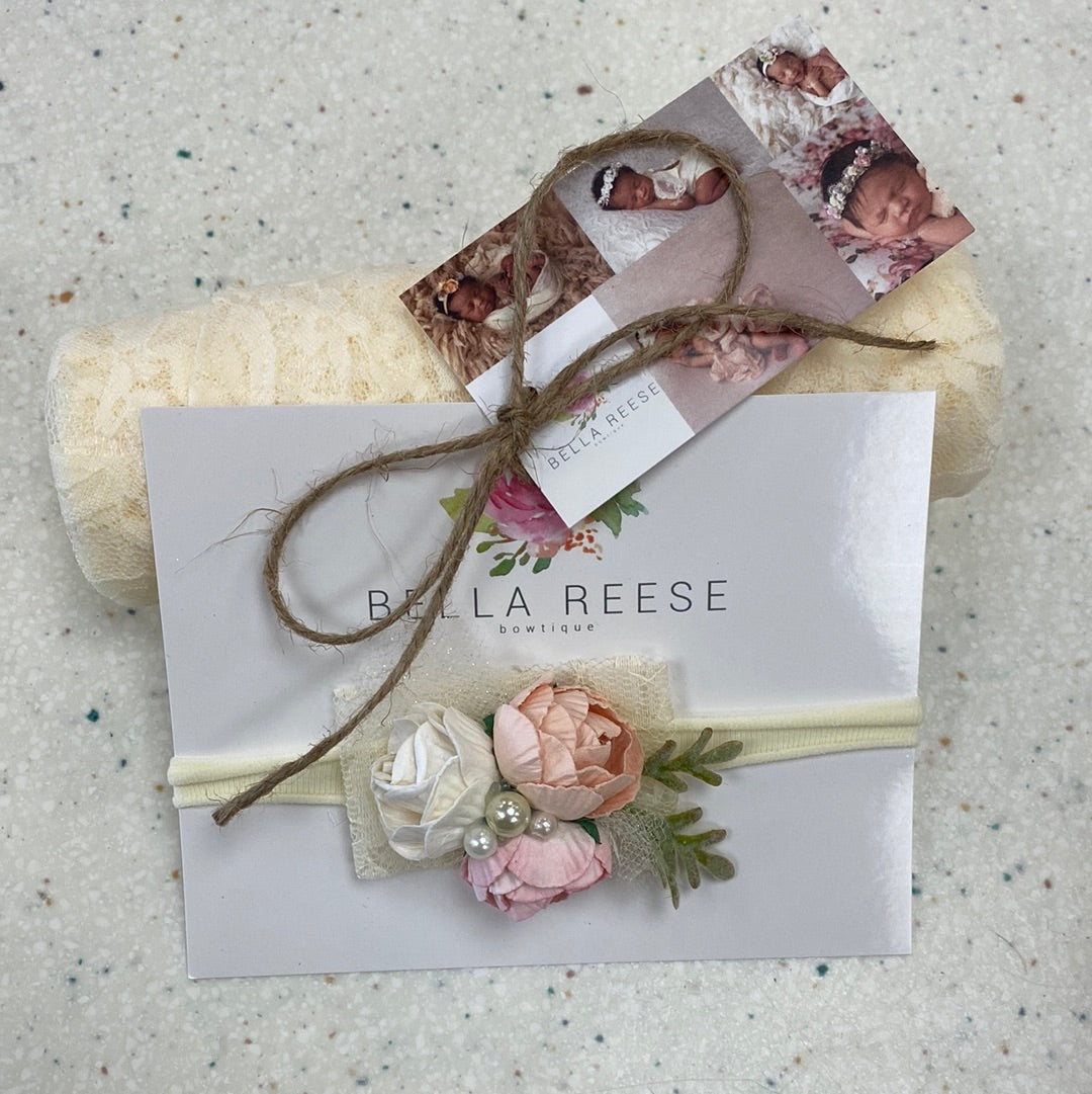 This set is perfect for newborn photos. Includes a 30 inch by 30 inch wrap and coordinating headband.