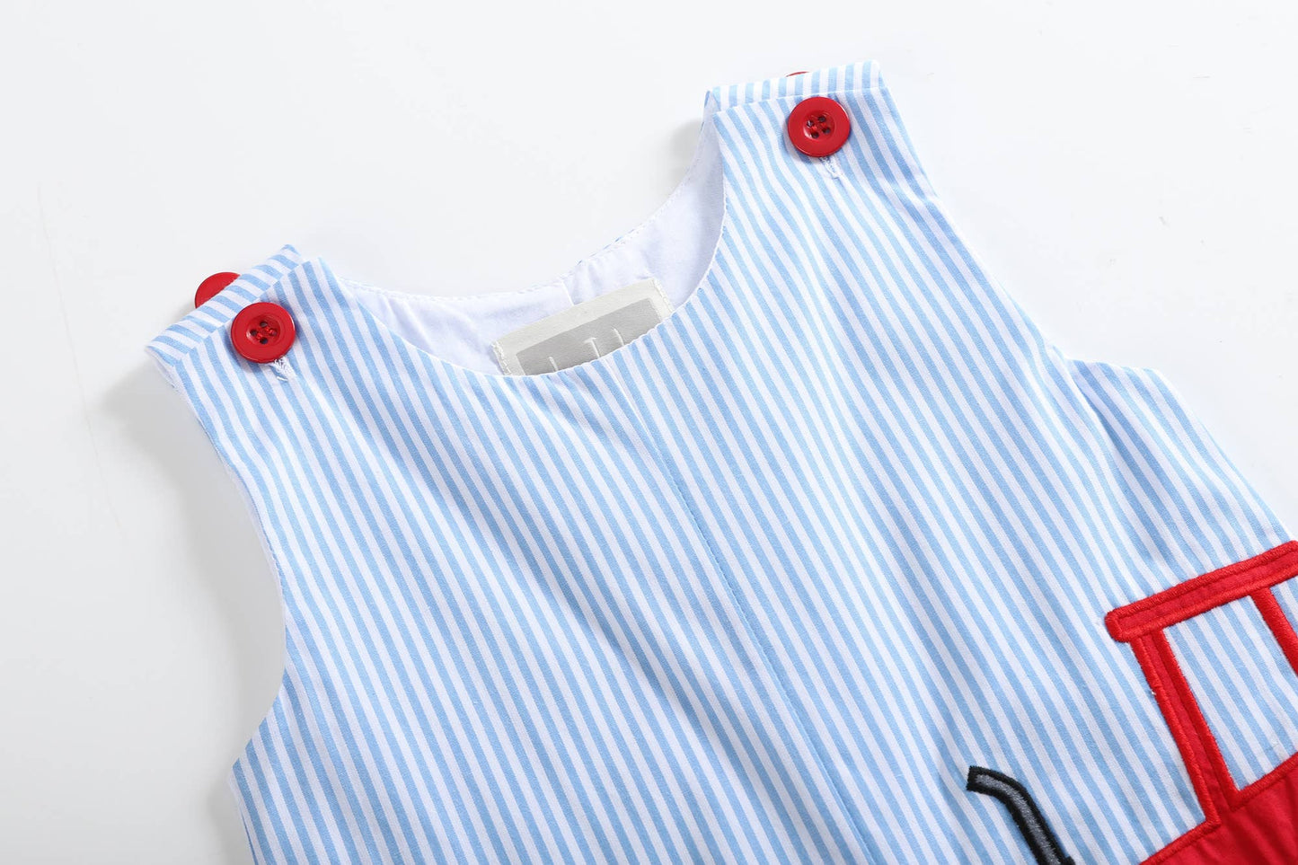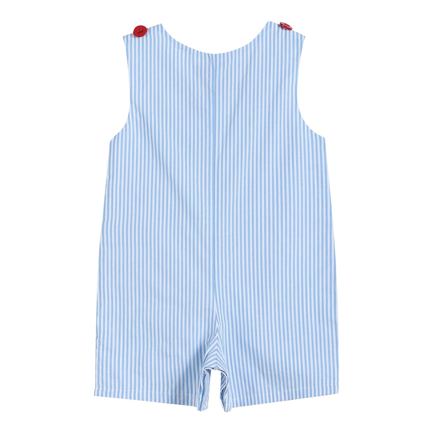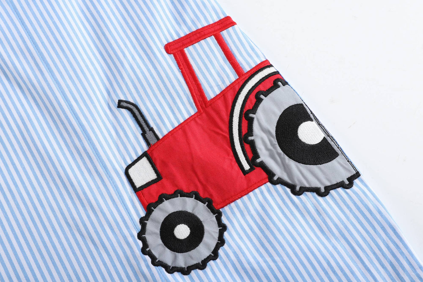 Made in a classic blue stripe and detailed with a cute tractor applique your little guy will love all the adventures he will get into wearing these adorable shortalls. Picture perfect and ready for a a day full of fun!