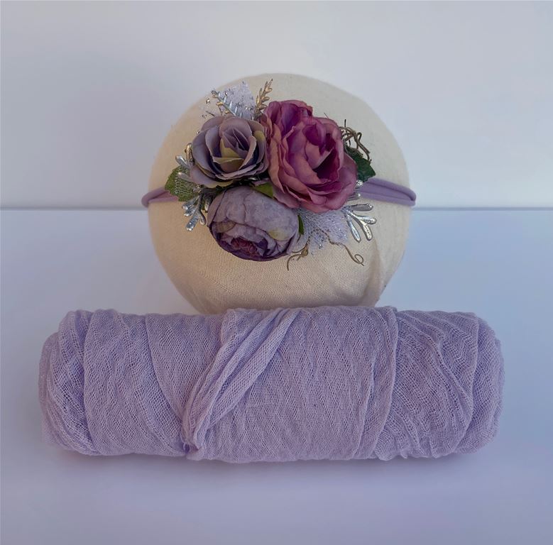 This set is perfect for newborn photos. Includes a 30 inch by 30 inch wrap and coordinating headband.