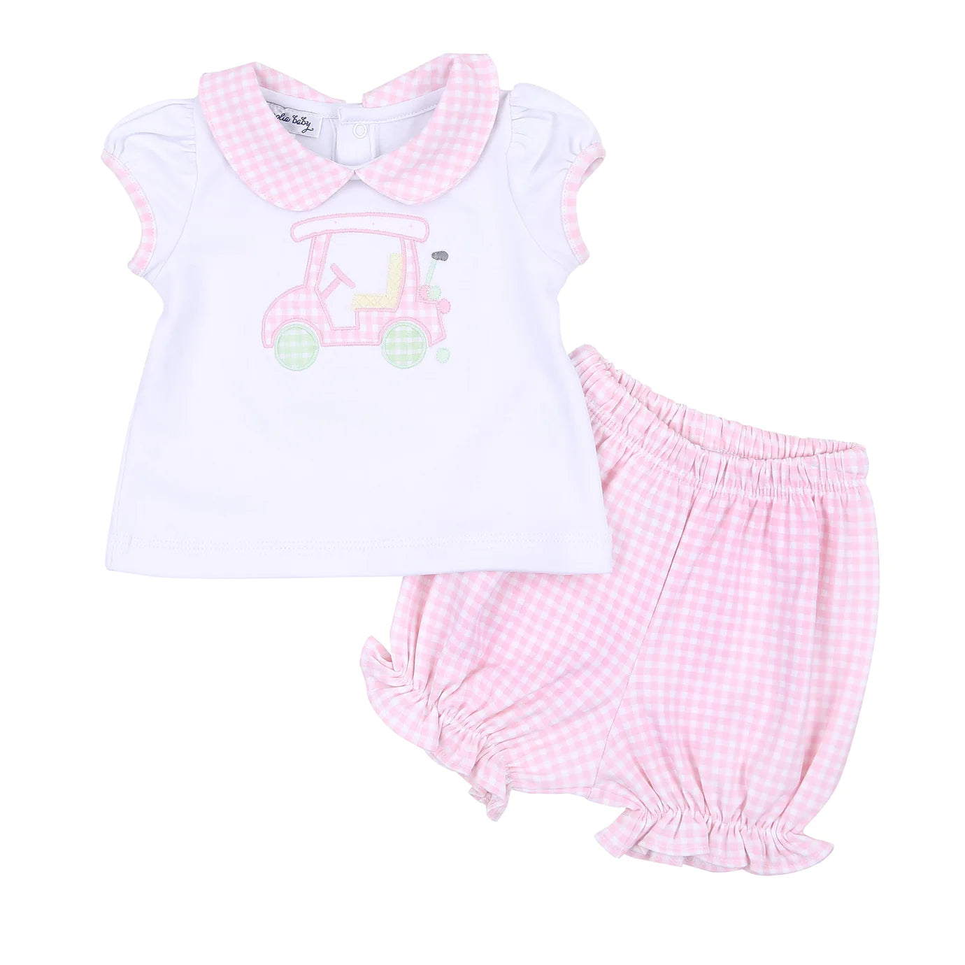 The sweetest set for a day on the golf course! Short sleeve shirt features golf club applique and gingham collar. Matching ruffled gingham diaper cover. Such a perfect gift!