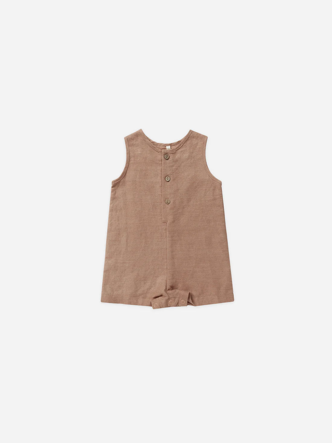 This slim cut sleeveless romper is an everyday essential for the warmer days ahead. Includes buttons on front and snaps along bottom for easy changes.