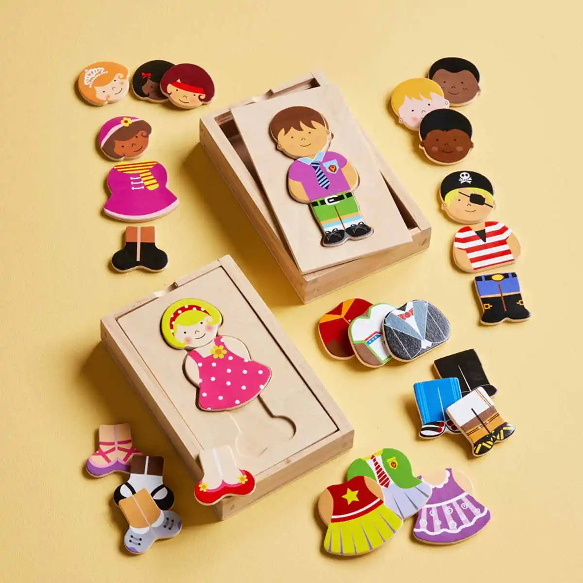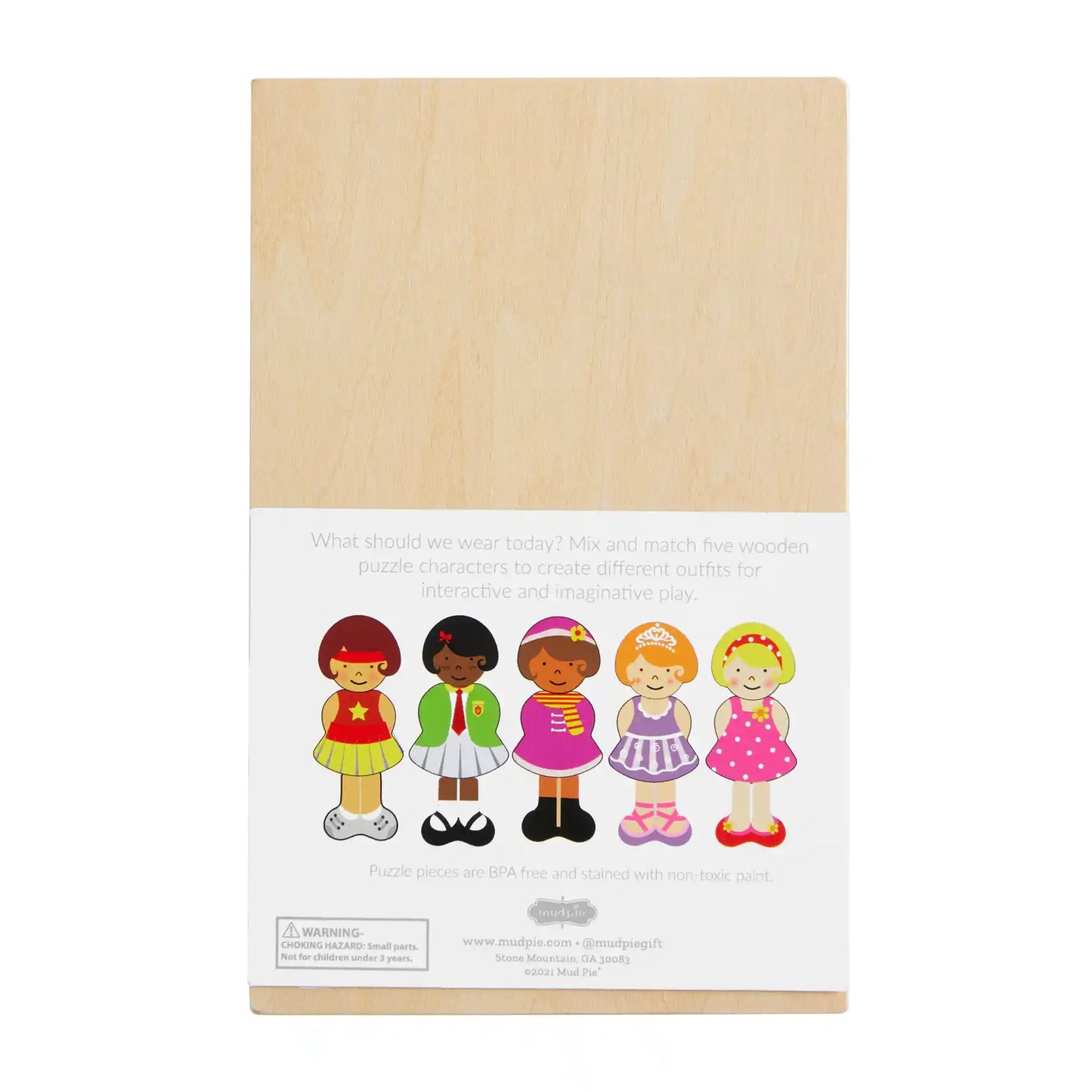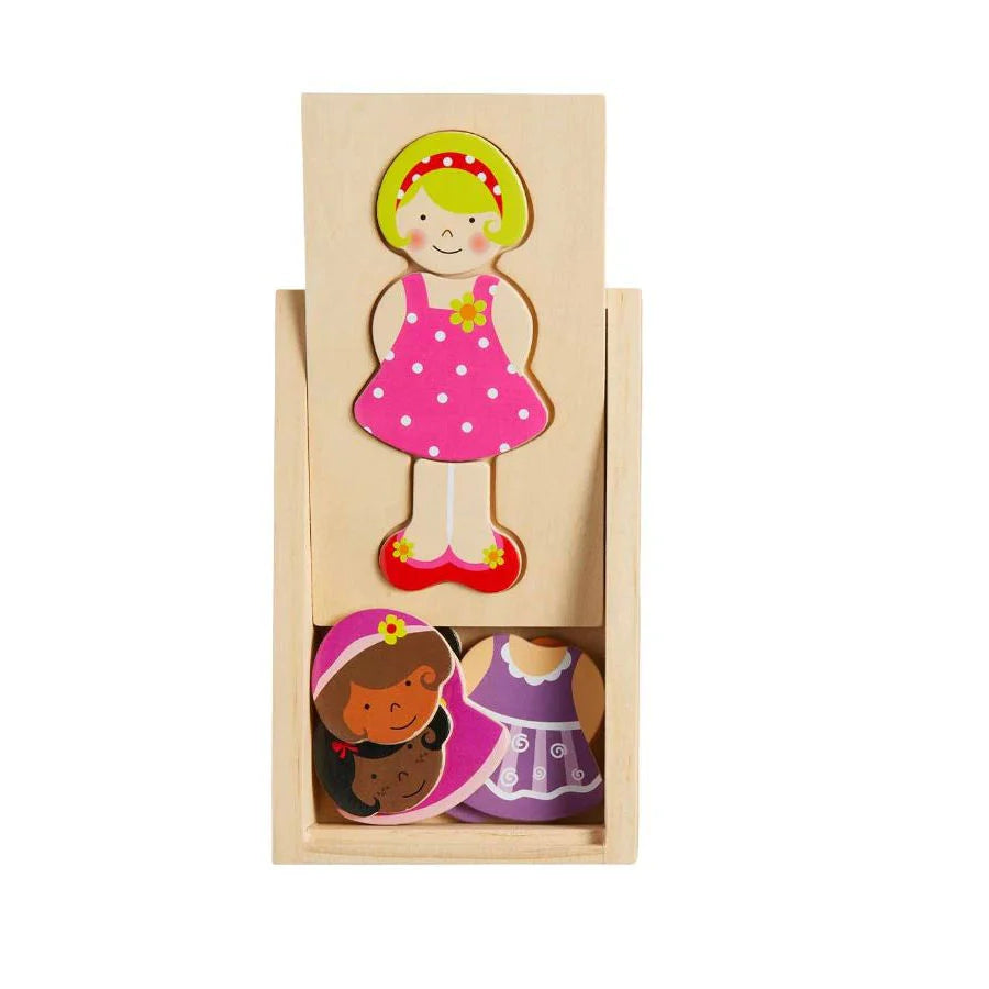 What should we wear today? Mix and match with our Girl Dress Up Wood puzzle. The set comes with various puzzle characters that can switched out and used to create different outfits. The set comes with 15-pieces that all store in a wooden storage box. The set is intended for ages 3+.