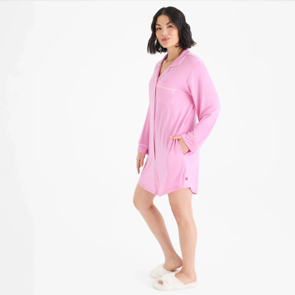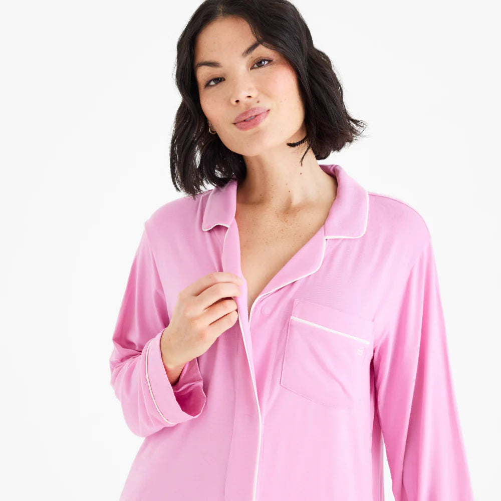 the women's classic with a twist sleep shirt has so many details to love: magnetic-fastening top, temperature-regulating fabric, and classic piping design. Made from eco-friendly TENCEL™ modal, these pajamas can withstand countless washes without pilling and the color never fades. Did we mention the loose, drapey fit designed to keep you cool under the covers? They're the kind of pajamas dreams are made of.