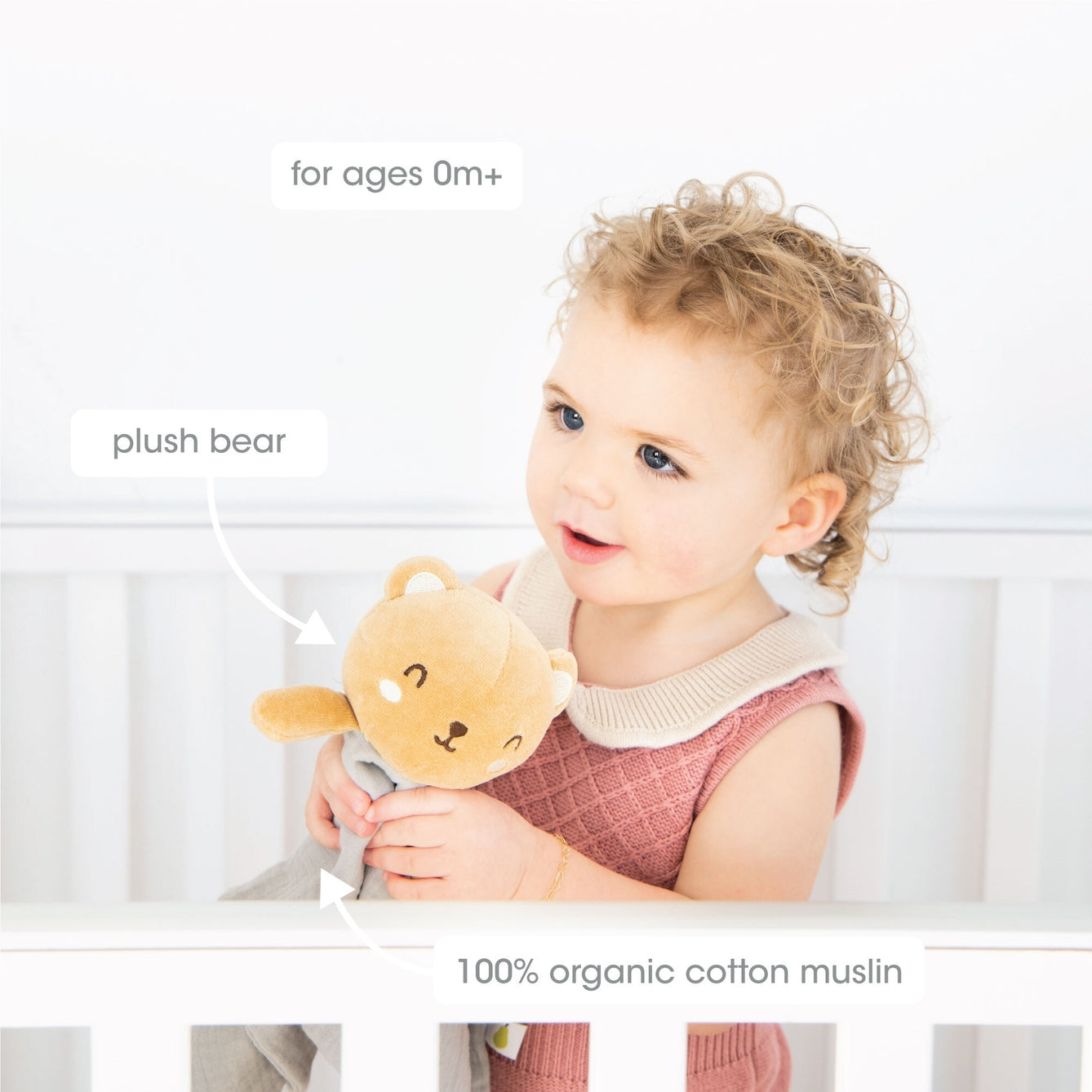 • Irresistibly Cute: Made with 100% organic cotton and cotton muslin, our modern snuggle toy features a neutral-colored plush bear head with movable arms and a soft, huggable muslin cream-colored blanket, it's friendly face is sure to capture your child's heart.
