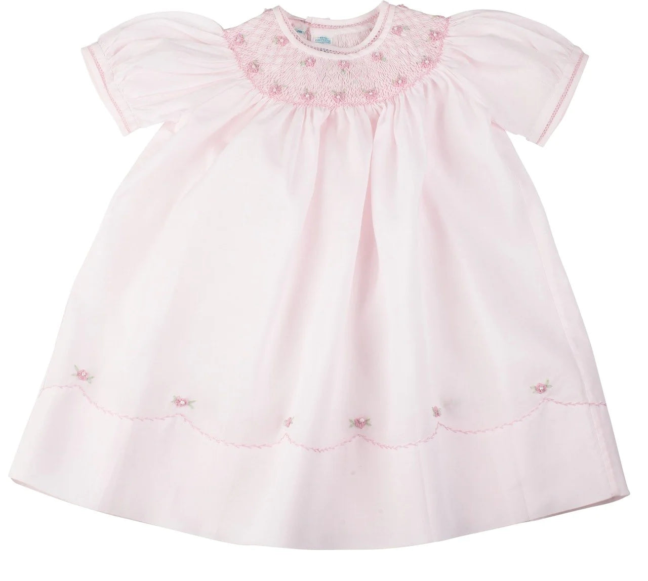 Everyday occasions made special, and special occasions made even better! In this beautiful bishop dress, your little girl is sure to shine. The Pearl Flower Bishop Dress features dainty fagoting lining the neck and puffed sleeves, along with a beautifully detailed smocked yoke. The smocking is embellished with exquisite hand embroidery - a diamond overlay and sweet floral bullions with pearls in the center. Matching flowers adorn the hem, just above a soft scallop shaped feather stitch. A vintage style baby dress, perfect for Easter, everyday spring wear, or Baby's first portrait. Another Feltman Brothers classic - sure to become a treasured family heirloom for generations!