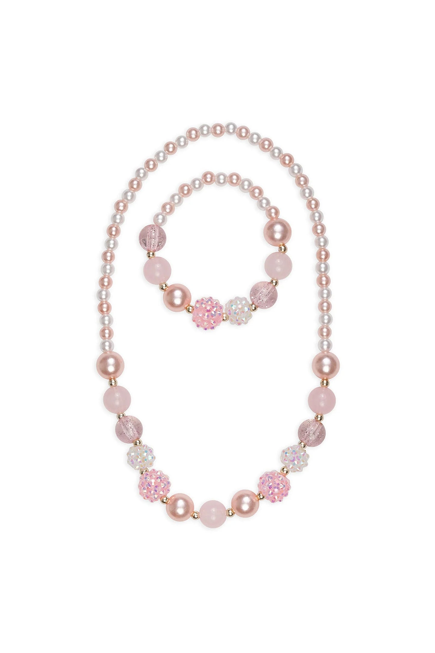 These are not your traditional pearls! This necklace bracelet set features a string of fun pearlized rose pink beads, iridescent chunky beads, and is all pulled together with some classic white pearl beads.