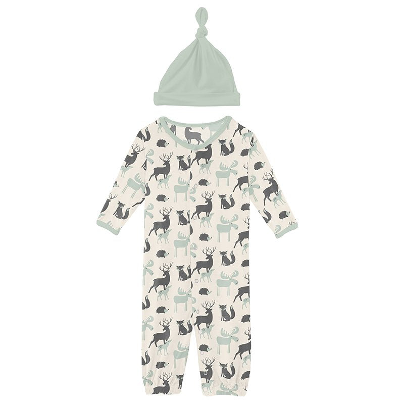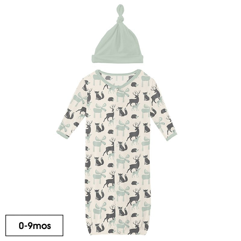 Print Layette Gown Converter and Knot Hat Set in Natural Forest Animals