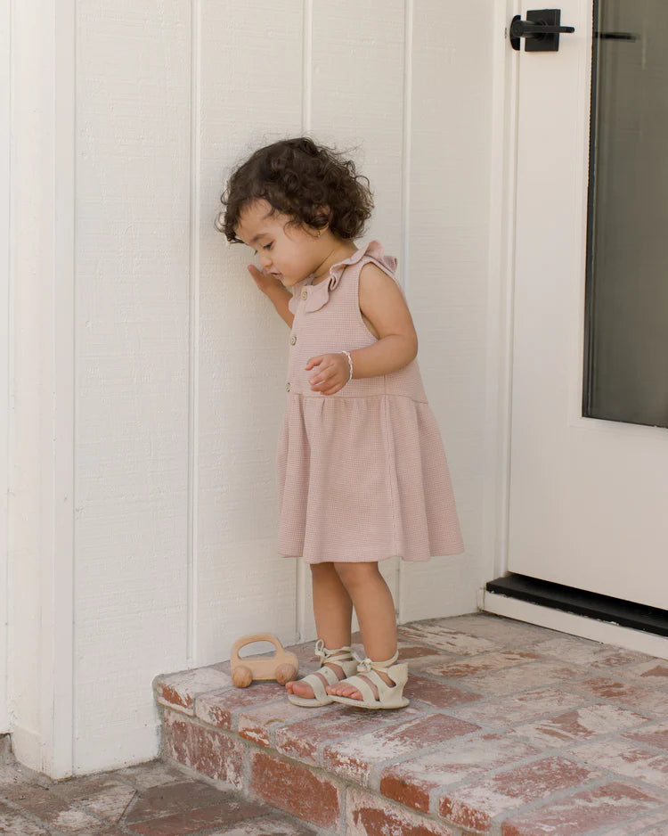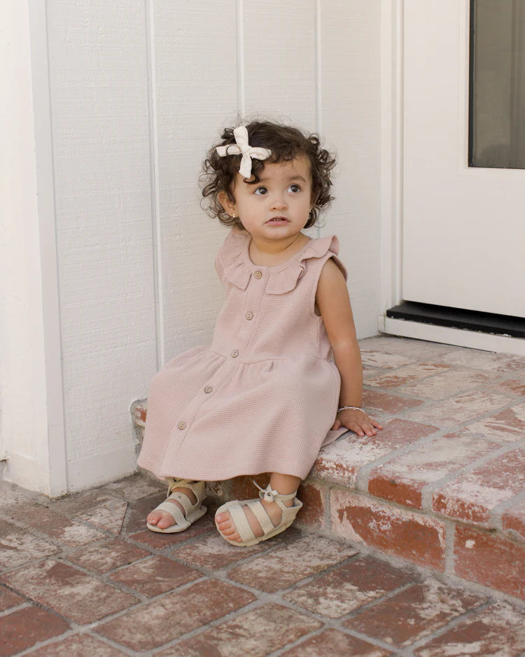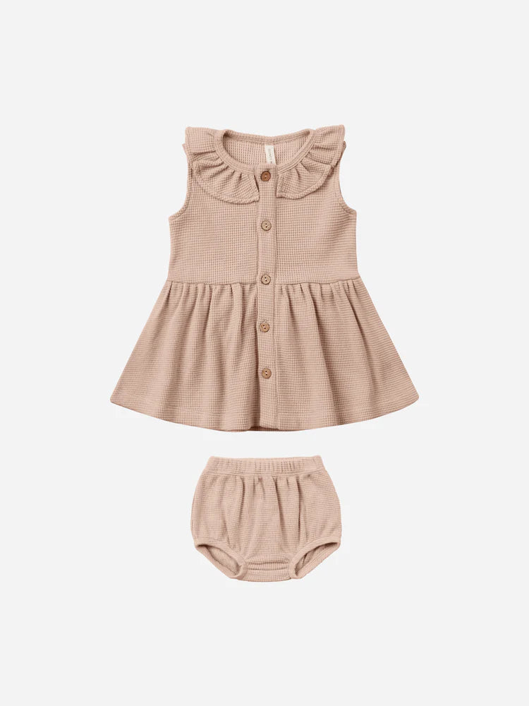 Our Waffle Collar Dress features a full skirt, buttons down the front, and a ruffled collar. All sizes include coordinating bloomers.