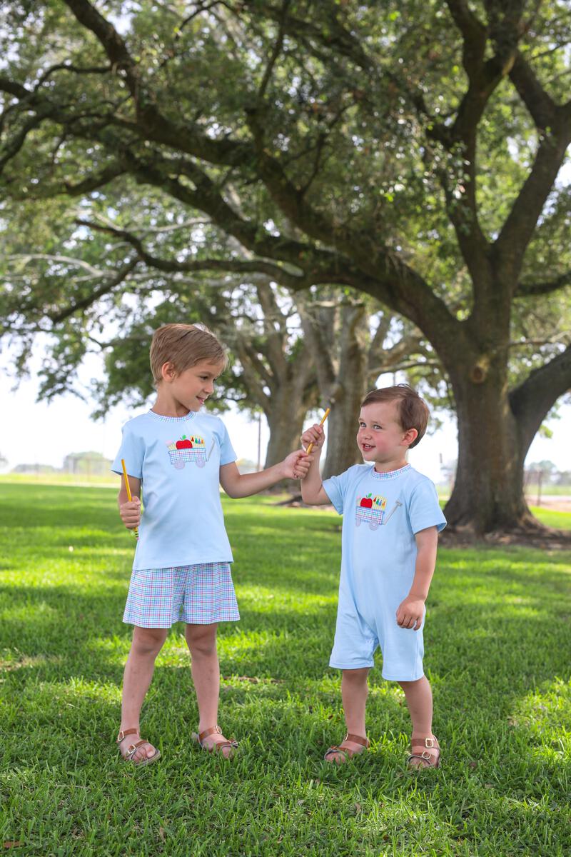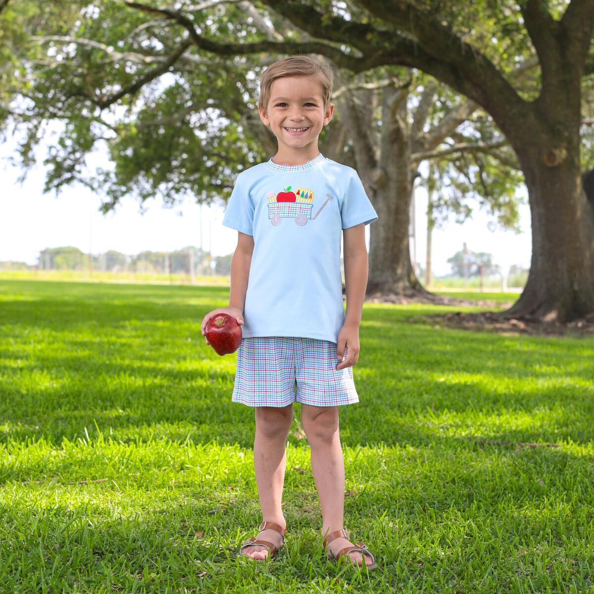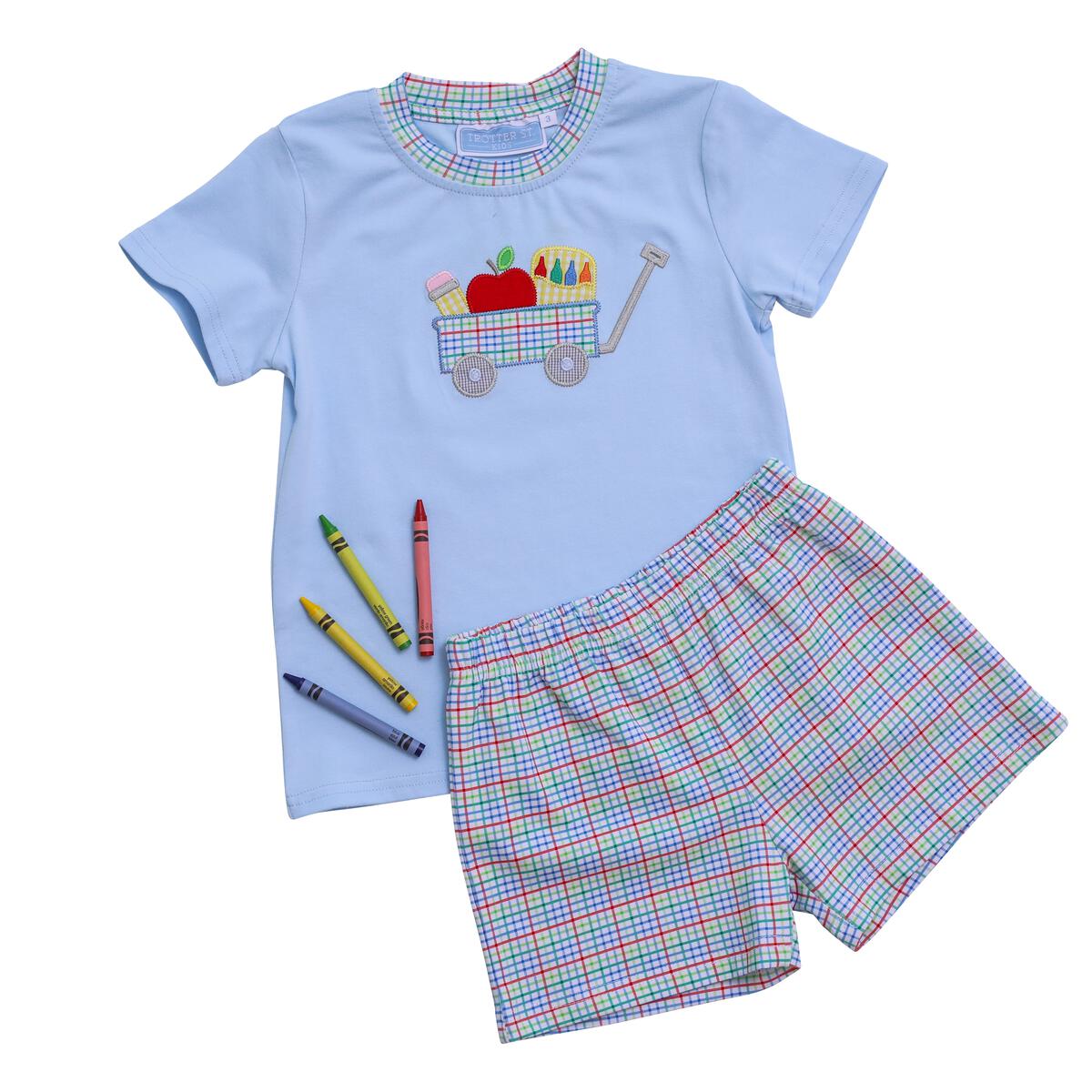 The cutest back to school look for boy! Plaid shorts paired with a wagon full of school supplies applique shirt. 95% cotton / 5% spandex