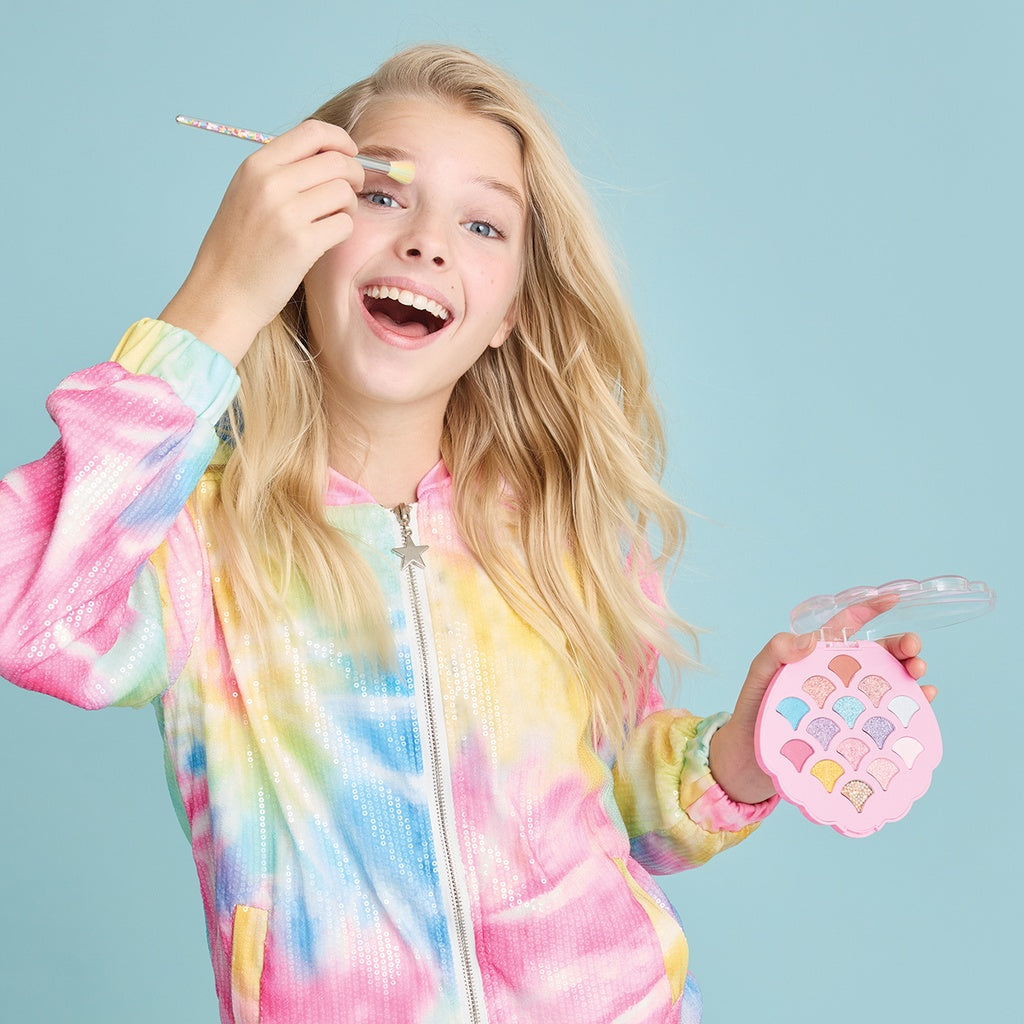 14 fun colors of powdered eyeshadows in merma-zing seashell palette