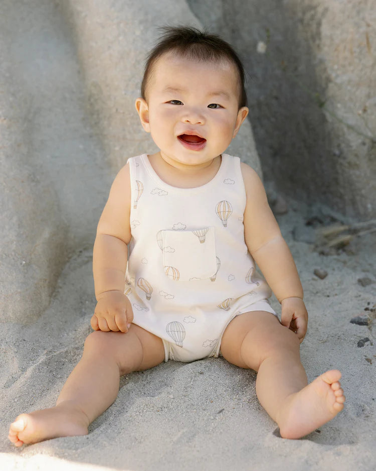 Perfect for warmer weather, our sleeveless one-piece is designed with a center pocket and bottom snaps for easy changes.