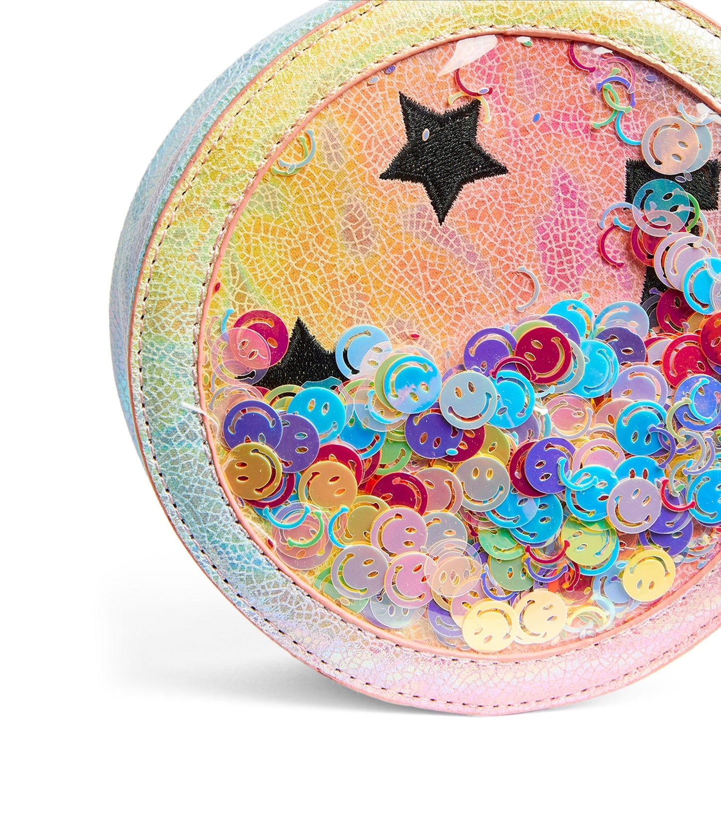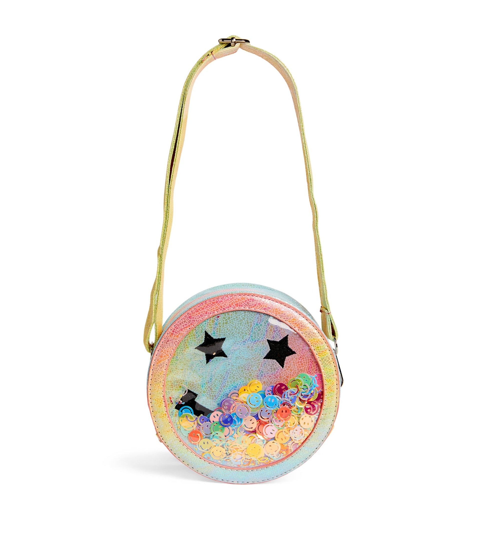 Zippered round bag with smile confetti. Includes shoulder strap. Colors vary.