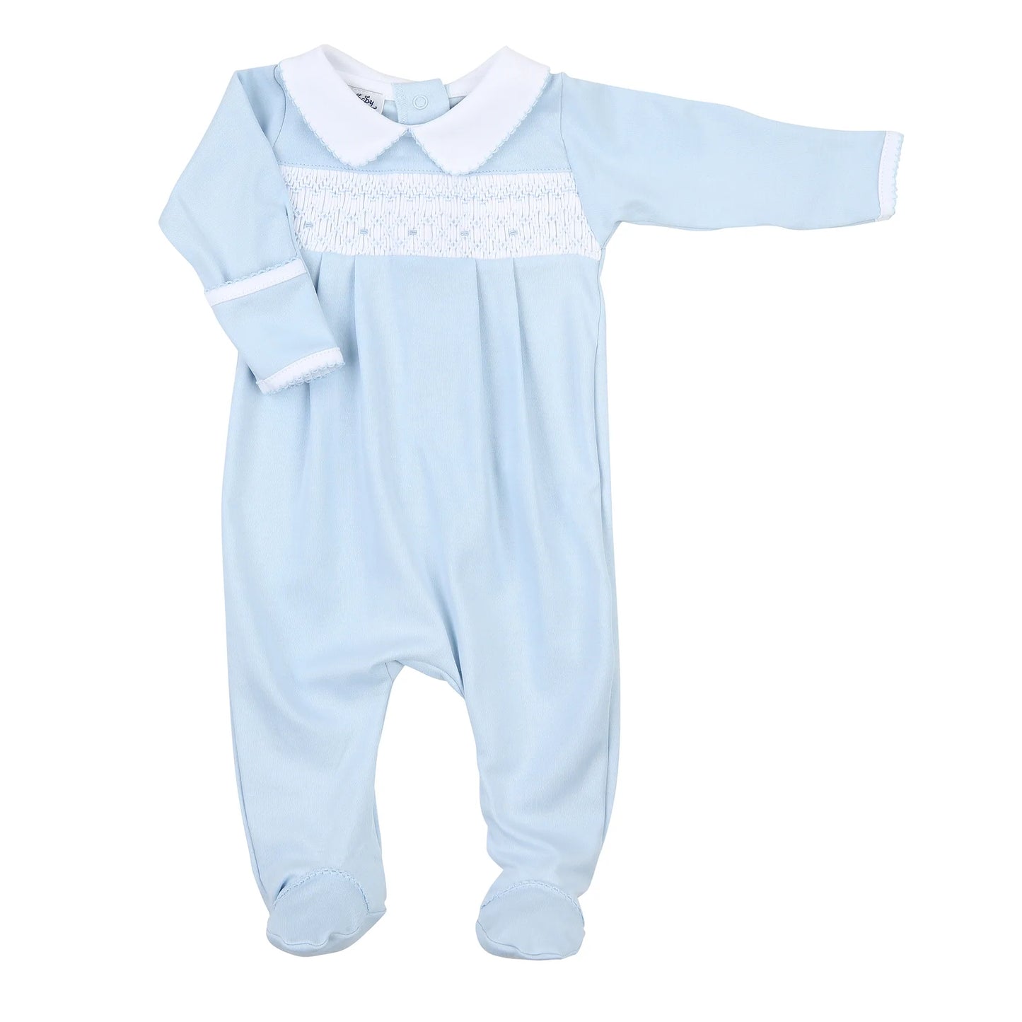 Long sleeve smocked footie with collar. Snaps at back and bottom.