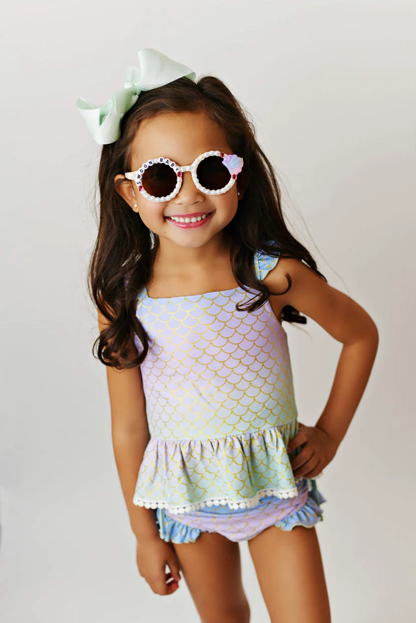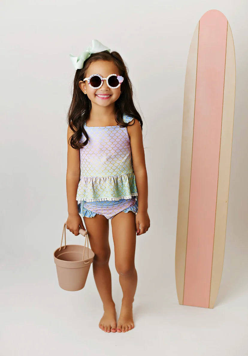 Two Piece tankini with mermaid print all over with criss cross back peplum style top with ruffled butt bottoms.