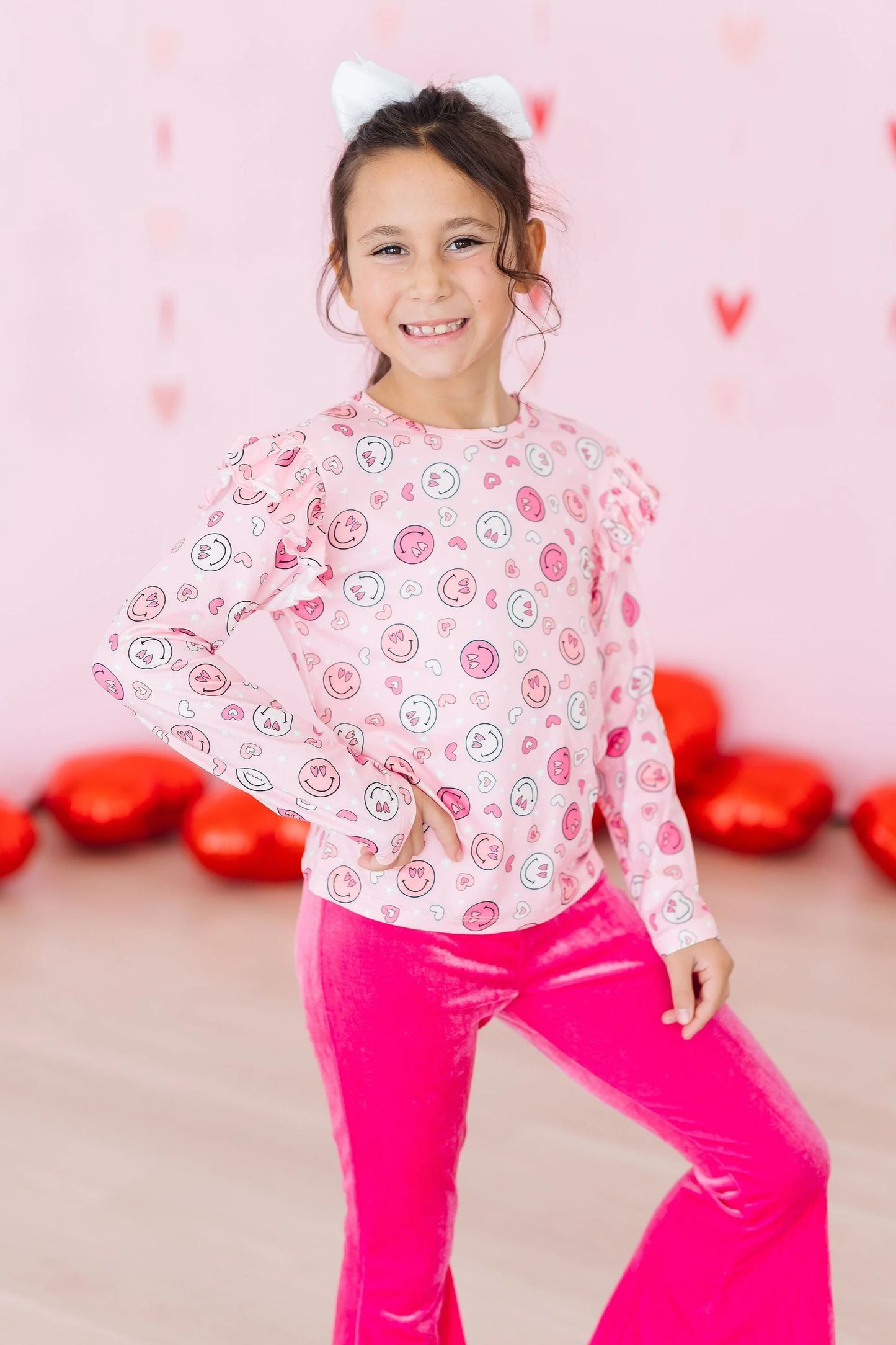 Our ruffle tee in vibrant prints is a favorite to pair with solid twirl skirts, leggings, or layered under a pinafore!